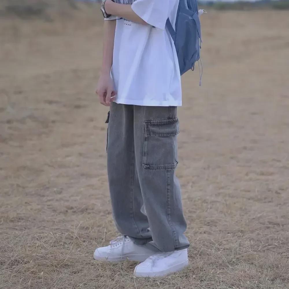Мужские модные синие джинсы прямого покроя в японском стиле с широкими штанинами и встроенным поясом 3XL черный серый