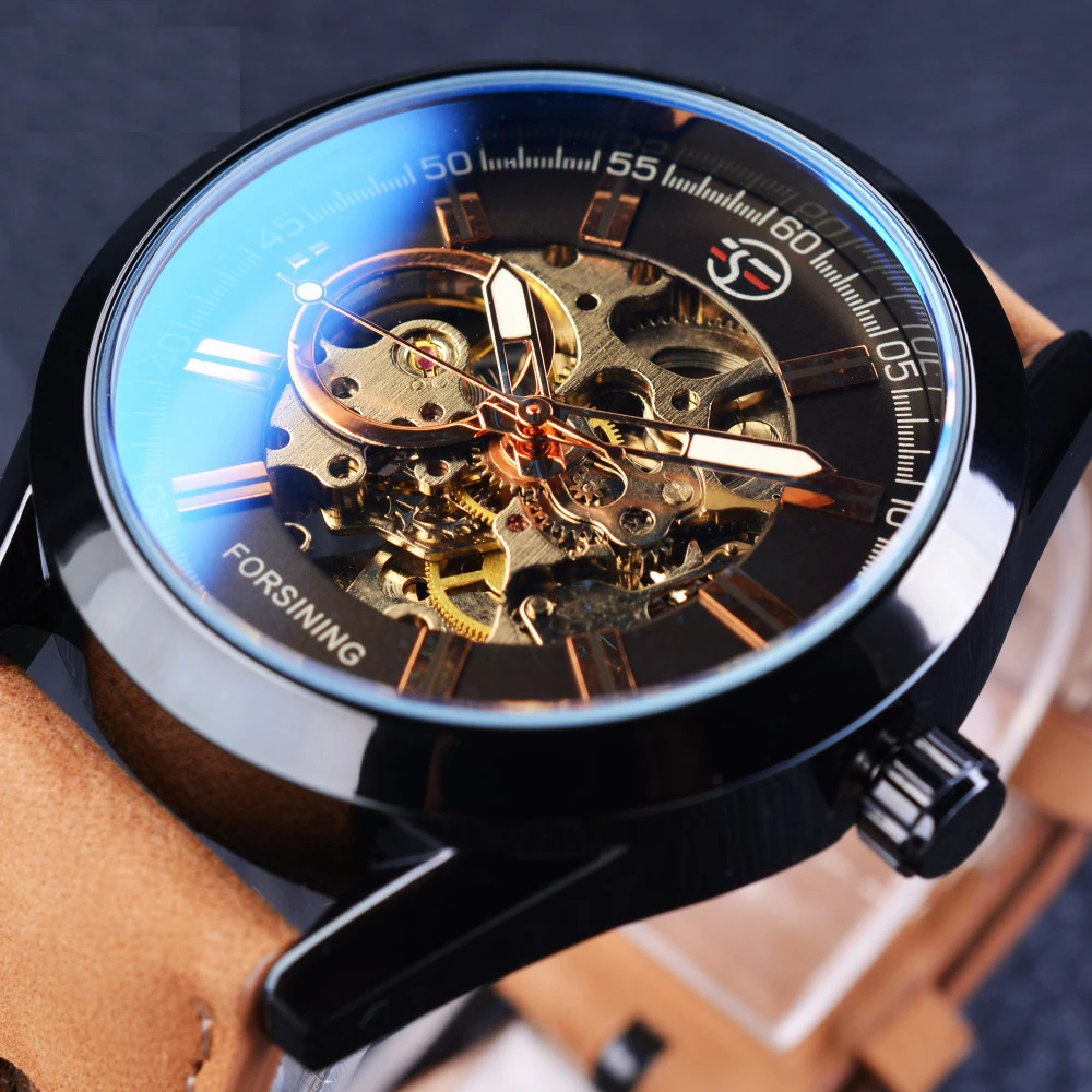 Мужские наручные часы в стиле стимпанк, коричневые наручные часы с ремешком, автоматические часы-скелетоны
