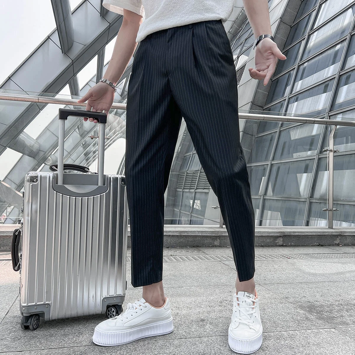 Мужские облегающие брюки в полоску, элегантные облегающие брюки до щиколотки для офиса, модель 29-36, 2023