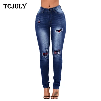 TCJULY Fashionable High Quality Cotton Blue Jeans Bleached Plaid Patchwork Push Up Denim Pants Washed Stretch Skinny Jeans Woman