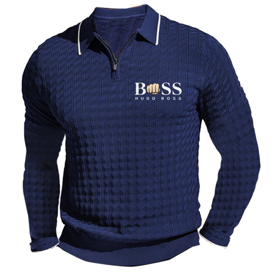 Мужские рубашки поло Boss Knit с длинным рукавом рубашка поло с молнией на четверть вафельная деловая повседневная футболка