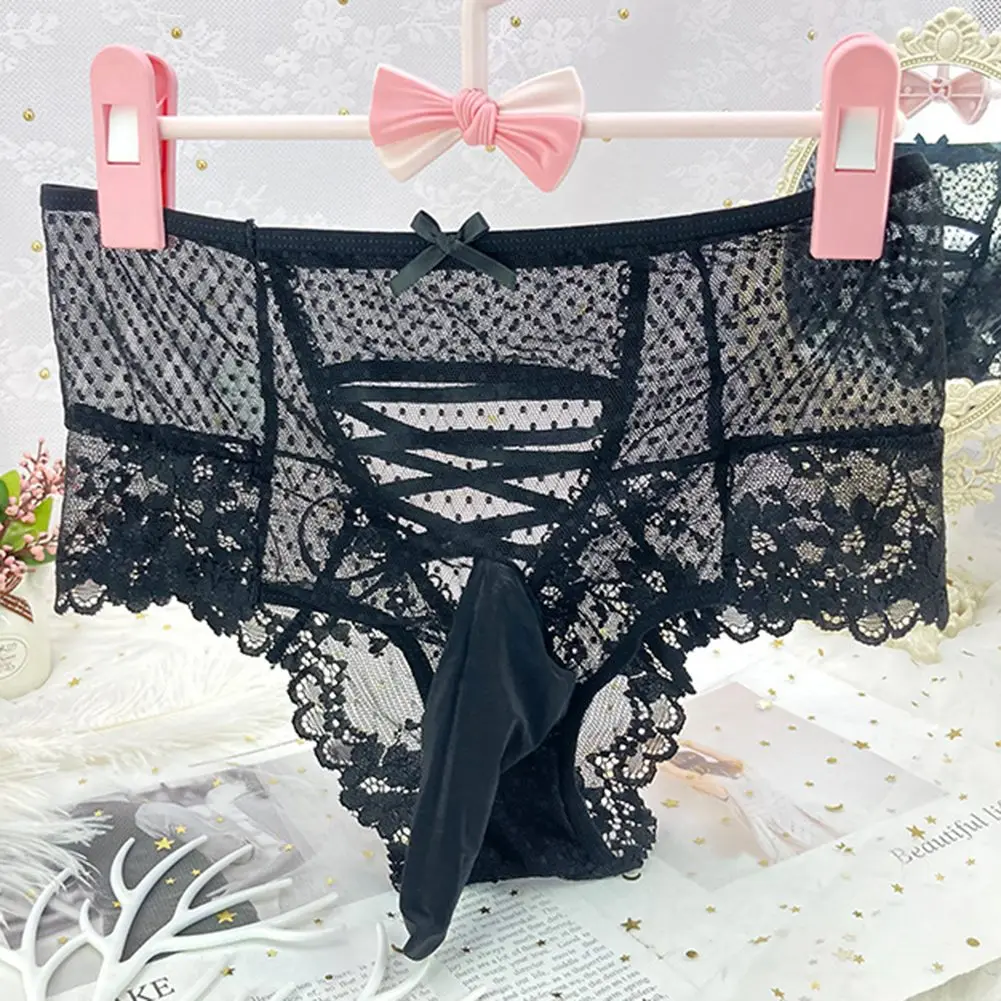 Мужские сексуальные трусики с карманом для пениса, прозрачное кружевное эротическое нижнее белье с вырезами средней талией