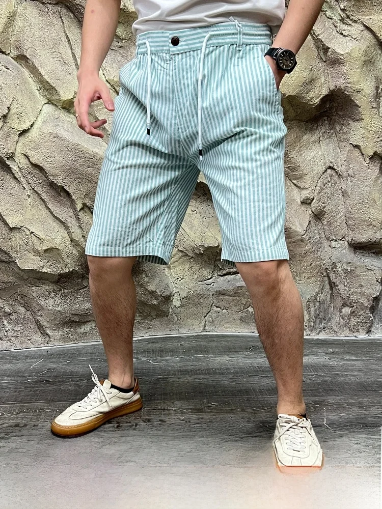 Мужские хлопковые льняные брюки в полоску в стиле ретро с эластичной резинкой на талии, летнее новое поступление, повседневные брюки, прямые брюки с высокой талией, пять четвертей, ле...