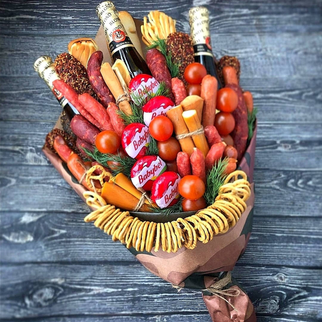 Мужской букет с пивом и закусками. В составе : пиво 3 бутылки, 3 вида колбас, 3 вида сыра, чери, Крекер. Состав композиции можно корректировать по Вашему желанию.