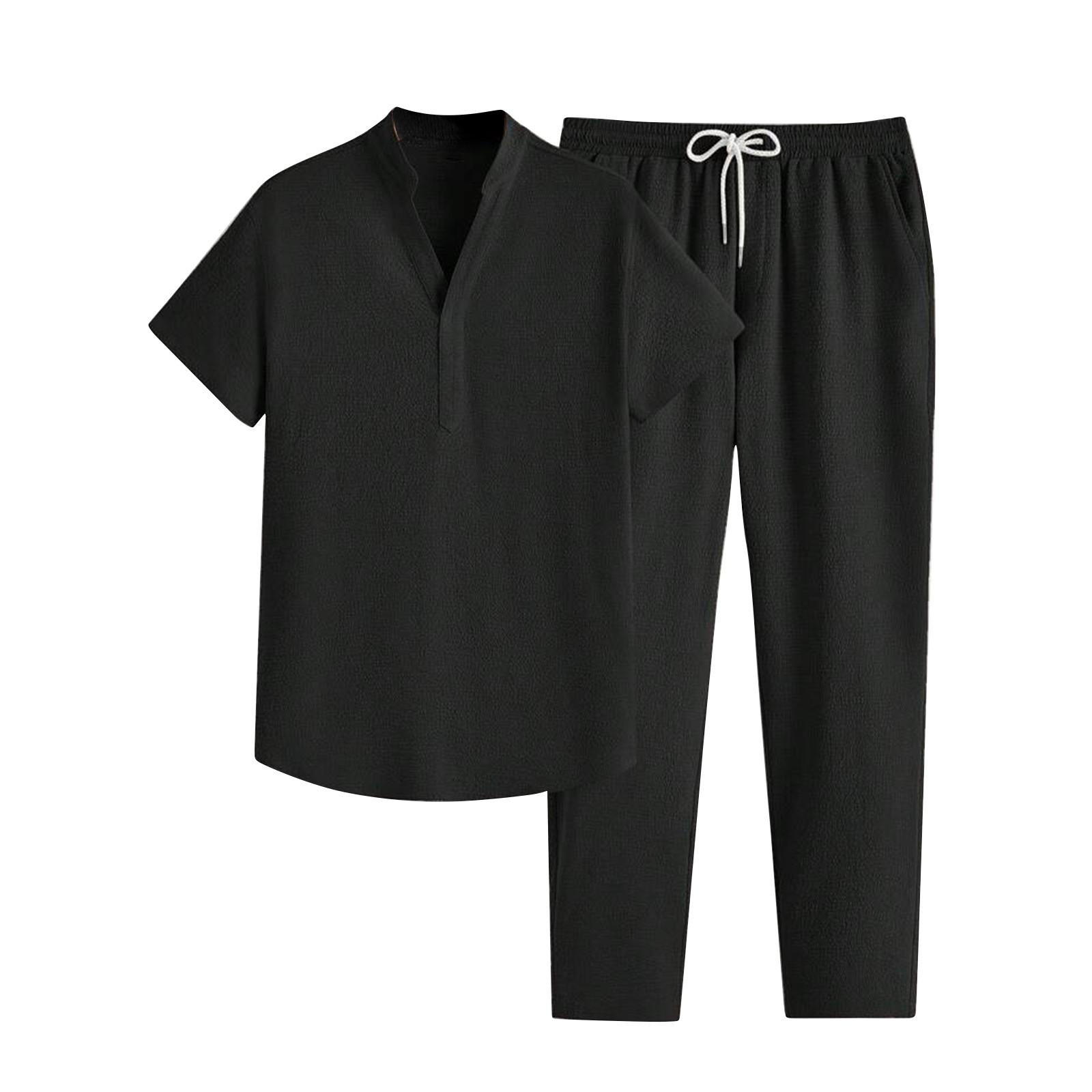 Мужской весенний костюм с коротким рукавом и V-образным вырезом без пуговиц, брюки, мужской повседневный модный костюм L чёрный