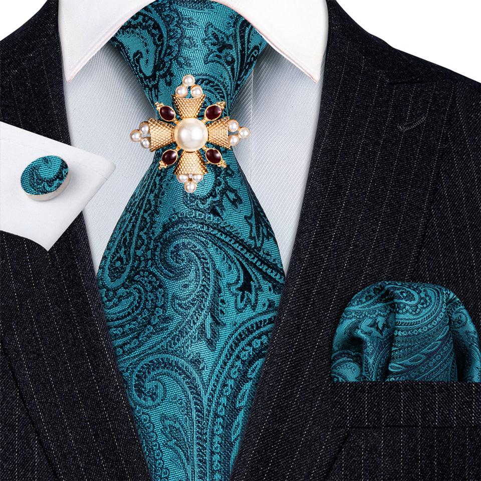 Мужской набор аксессуаров. Жаккардовый галстук с брошью, платок и запонки N-5164