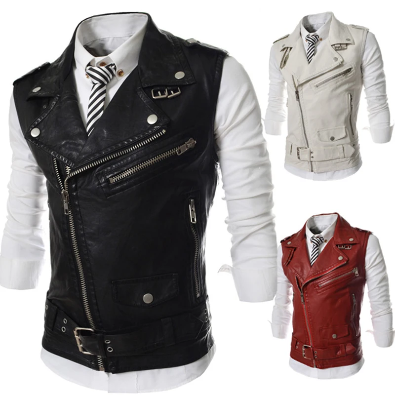 Мужской короткий кожаный жилет на молнии, Черный Повседневный жилет с отложным воротником в стиле панк, 2021