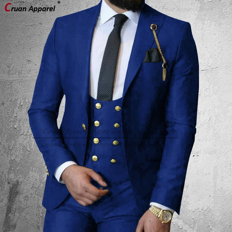 Мужской костюм ярко-синего цвета, облегающая куртка с золотыми пуговицами, двубортный жилет, брюки, смокинги, 3 шт.