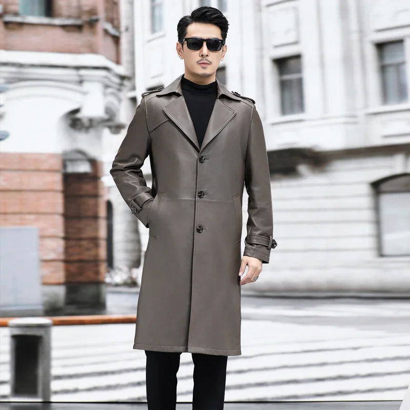 Мужской повседневный тренчкот из натуральной овечьей кожи, облегающий жакет до колен с воротником-костюмом, новинка 2023