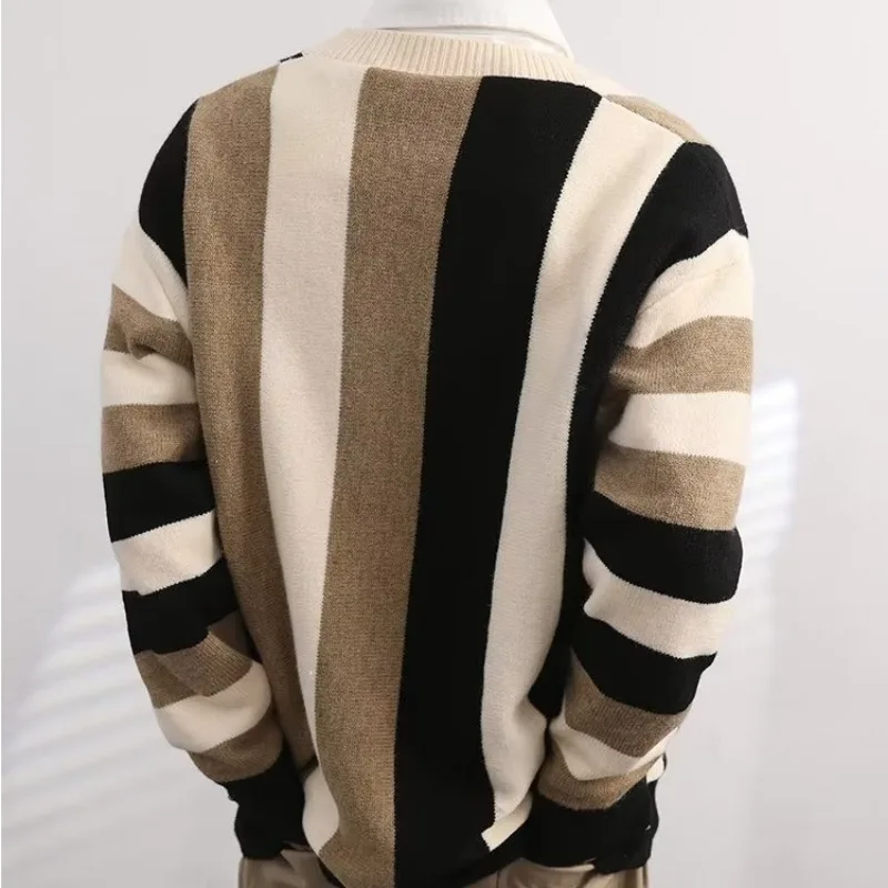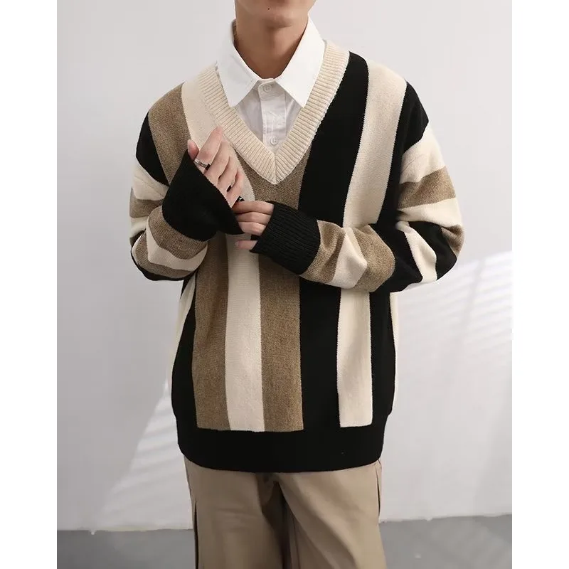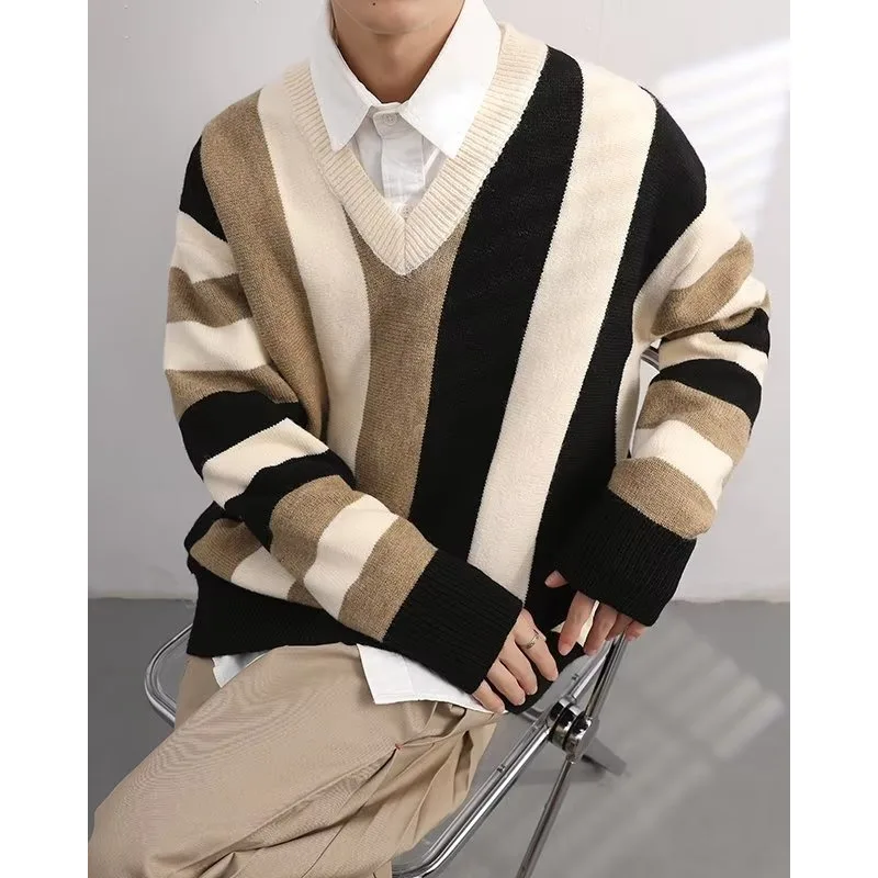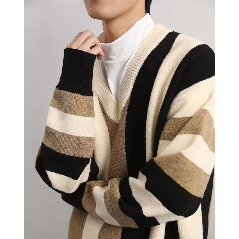 Мужской пуловер с V-образным вырезом и контрастными полосками