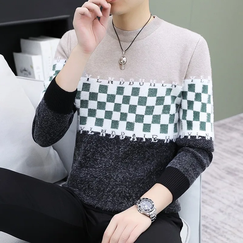 Мужской свитер в клетку, теплый плотный пуловер с цветным блокировкой, зима 2023