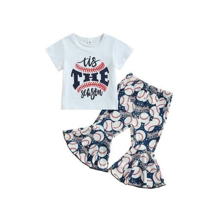 Bagilaanoe 2pcs Toddler Baby Girl Long Pants Set Letter Print Short Sleeve T-Shirts Tops + Flare Trousers 6M 12M 18M 24M 3T 4T Kids Casual Outfits