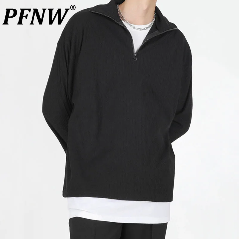 Мужской трикотажный пуловер с лацканами PFNW, черный Однотонный свитер с полумолнией, модная одежда в Корейском стиле для осени, 24B3366