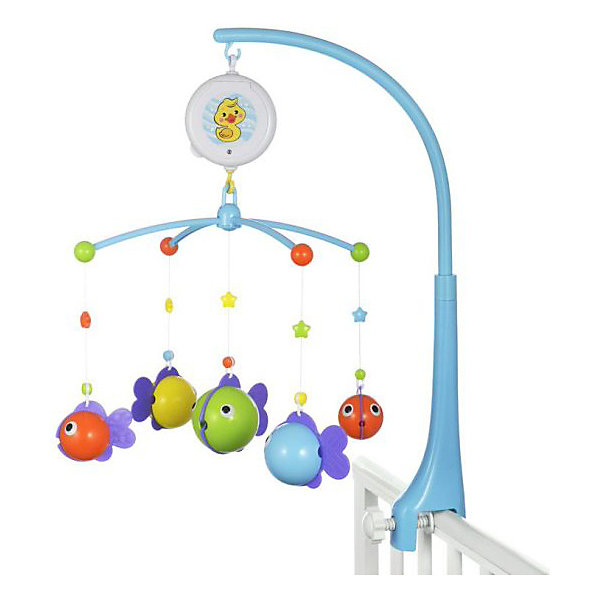 Музыкальный мобиль имеет один режим работы, он крутится, заставляя подвесные игрушки вращаться по кругу, и проигрывает музыку. Со временем рыбок можно снять и играть с ними в ванной, весело играя во время купания. А хвостики и плавники идеально подойдут для прорезывания зубок малыша. Все детали изготовлены из качественных и безопасных материалов. Развивает слуховое и цветовое восприятия, а также тактильные ощущения и мелкую моторику.
