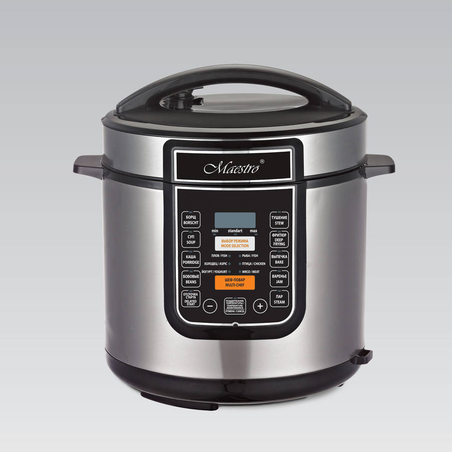 C замечательной мультиваркой Maestro MR-790, оснащенной 11 разными программами, Вы приготовите аппетитные супы и каши, стушите ароматные мясные блюда, а также испечете вкусную домашнюю выпечку. Maestro MR-790 очень проста и понятна в управлении, благодаря электронной системе и большому LCD дисплею. Емкость для приготовления еды покрыта специальным антипригарным покрытием, а корпус Maestro MR-790 изготовлен из нержавеющей стали, все это в комплексе обеспечит более длительное время эксплуатации мультиварки. С Maestro MR-790 Вы сможете управлять своим временем и легко планировать, ведь таймер отсрочки старта позволит включить мультиварку в работу в удобное для Вас время, независимо от Вашего места нахождения.Характеристики:Позволяет приготовить блюда в 2 раза быстрее, благодаря высокому давлениюЭлектронное управление15 программ для приготовления различных блюд15 програм приготовления: Борщ, Суп, Каша, Бобовые, Пар, Варенье, Выпечка, Фритюр, Тушение, Плов, Холодец, Йогурт, Рыба, Птица, МясоРежимы “Поддержка температуры”, “Отсрочка старта”, “Шеф-повар”Внутреннее антипригарное покрытиеВ комплекте: корзина-фритюрница, контейнер-пароварка, мерный стакан, ложкаКерамическое антипригарное покрытие чашиОбъём: 5л220-240В, ~ 50Гц, 1200Вт