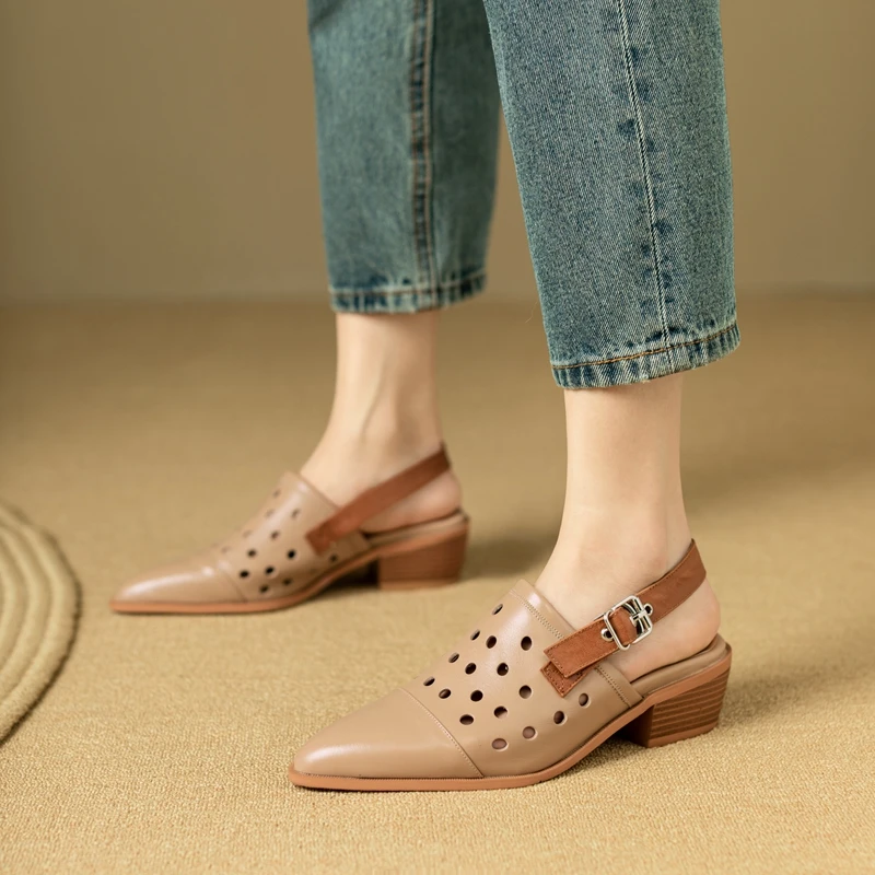 2024 Women's New Spring/Summer Pointed Retro Genuine Leather Hollow Large Heel Baotou Comfortable Muller Sandals