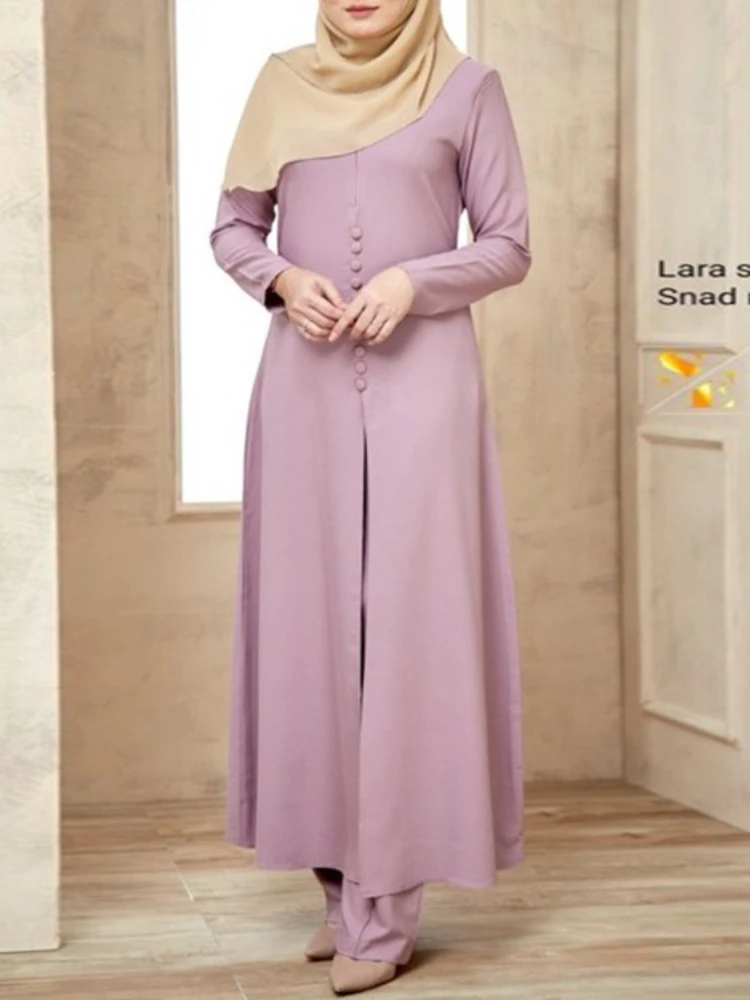 Мусульманский комплект из 2 предметов Abaya комплект из 2 предметов для женщин Арабская Турция Дубай разрез круглый вырез с длинным рукавом Рамадан ИД исламский костюм брюки