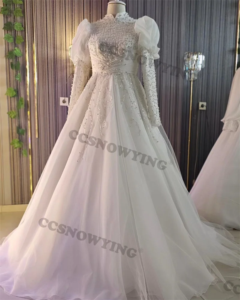 Мусульманское свадебное платье с длинным рукавом для невесты, Тюлевое женское платье невесты из бисера в арабском стиле, женское платье невесты с высоким воротником