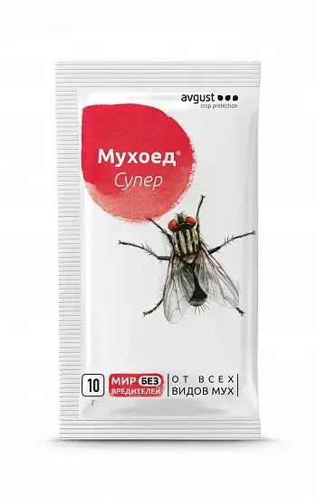 «Мухоед Супер» содержит пищевые добавки, которые привлекают к себе мух, гарантируя этим их уничтожение.