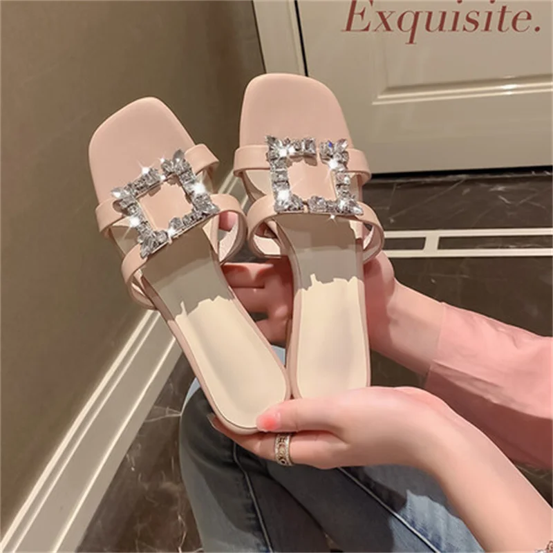 Мюли женские на низком каблуке, Хрустальные кожаные модные сандалии с квадратным носком, без застежки, простые туфли с ремешком на пятке