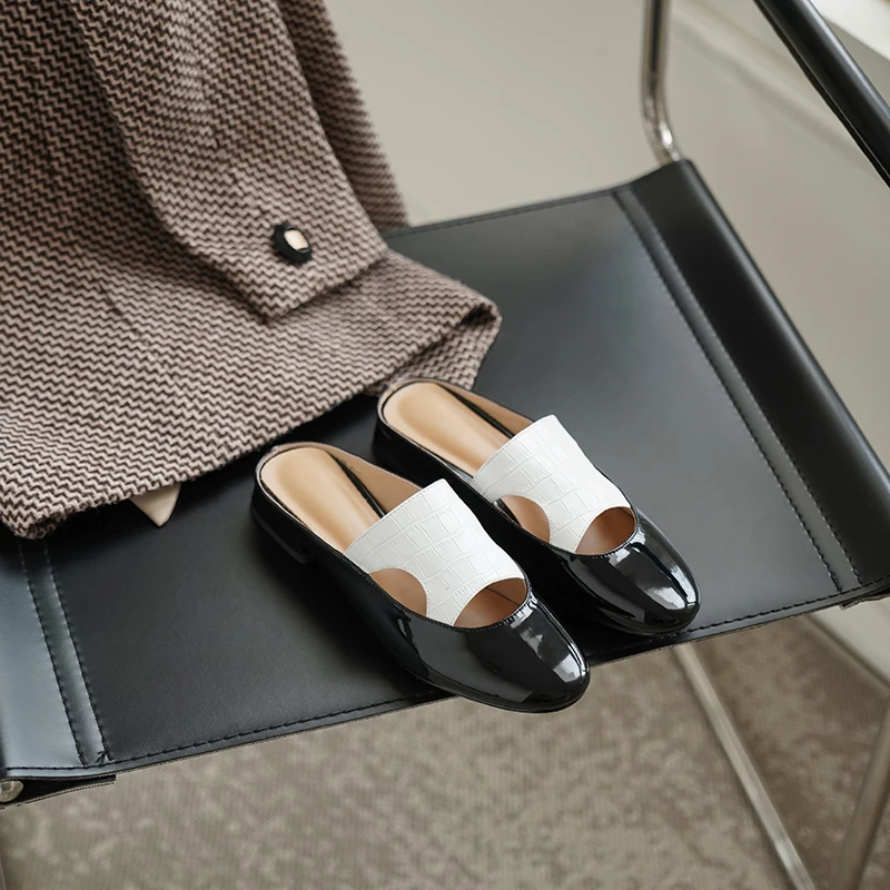 Мюли женские на плоской подошве, повседневные туфли без задника, круглый носок, лакированная кожа, мягкая обувь на плоской подошве, в просто...