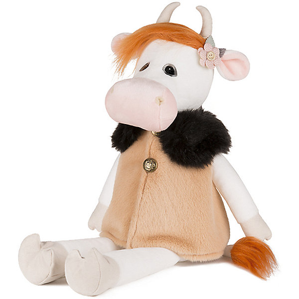 Мягкая игрушка выполнена в виде коровки, которая к тому же одета. Обладает шелковистой, приятной на ощупь шёрсткой.