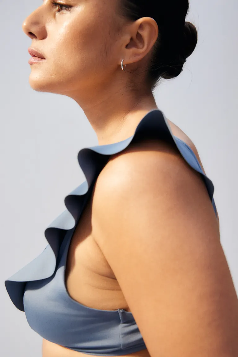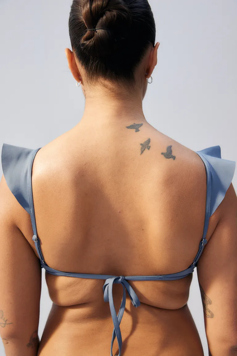 Лиф бикини без косточек на подкладке и V-образным вырезом с оборкой, переходящим на плечи. Регулируемые бретели и чашки со съемными вставками, которые придают груди форму и обеспечивают хорошую поддержку. Завязки сзади. Стиль: Бюстгальтер без косточек, Бюстгальтер с мягкими чашечками Вырез: V-образный