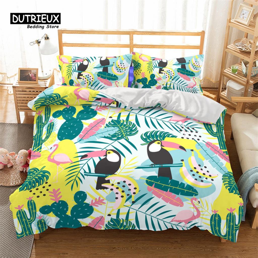 Мягкий комплект постельного белья с 3D-принтом «Фламинго», свежий стиль, мультяшные животные, зеленые листья, тропические фрукты, цветочные пододеяльники с наволочками EU single(135x200cm)