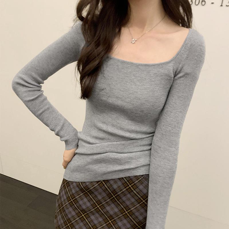 Мягкий и эластичный свитер с U-образным вырезом в корейском стиле для женщин, новый утягивающий черный топ с длинными рукавами на осень и зиму L