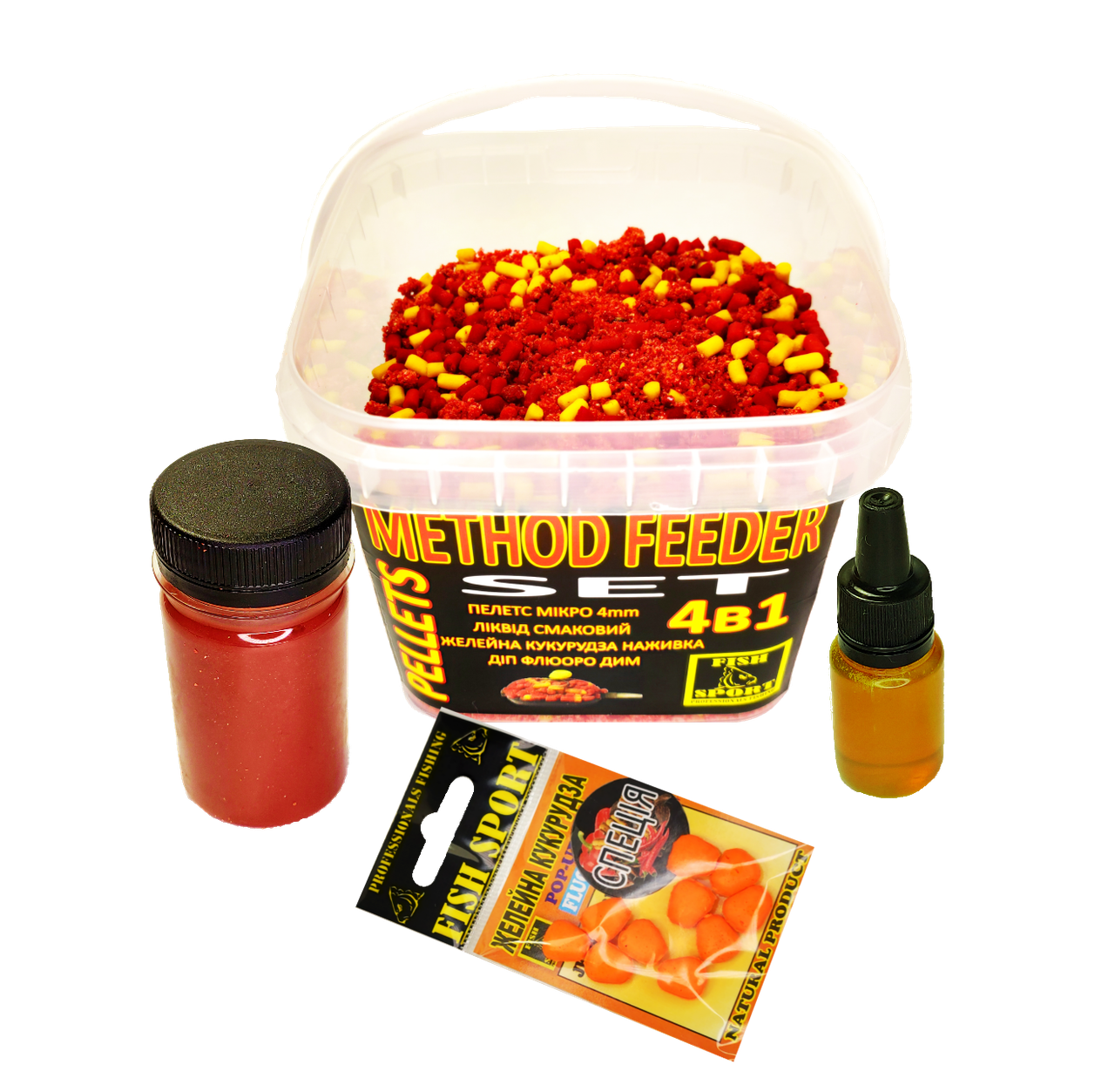 НАБОР 4в1 Method Feeder (Кальмар-осьминог) в состав входит: Пелетс 4 мм + Активатор клева Ликвид вкусовой Сладкая специя Дип с эффектом флюоро дым Специя Наживка Желейная пливающая кукуруза 10 мм Специя Для использования нужно залить ликвид в пелетс с активатором клева и размешать оставить на 10 мин Использовать с Flat method или другими видами кормушек Дип с эффектом флюоро дым наносить на поверхность кормушки с Пеллеты. Желейную пливающую кукурузу использовать на леску или непосредственно насаживать на крючок