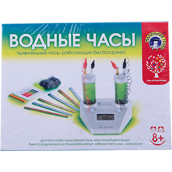Набор "Водяные часы" позволяет сделать батарею, благодаря которой можно получать электричество из воды и других подручных материалов (раствора зубной пасты или газированных напитков). После того, как вы соберете и запустите часы, вам не потребуется менять в них батарейки. Инструкция содержит подробную информацию о принципе работы батареи и о химической реакции, которая позволяет получать электричество.