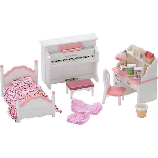 Интерьер комнатки для юной леди из Sylvanian Families выполнен в классическом стиле в бело-розовой гамме. В ней есть все, что требуется для занятий, увлекательного досуга и отдыха малышки – пианино, письменный стол, уютная кроватка и пижама.