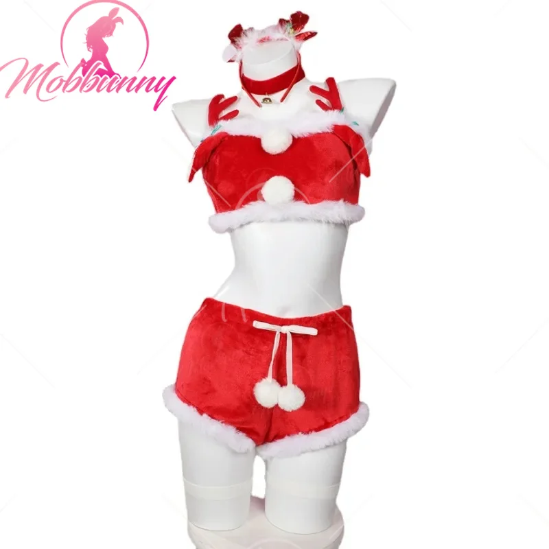 Mobbunny Women Christmas Sexy Lingerie Set Kawaii Reindeer Style Coaplay Costume Plush Crop Top Shorts Set with Headband Choker