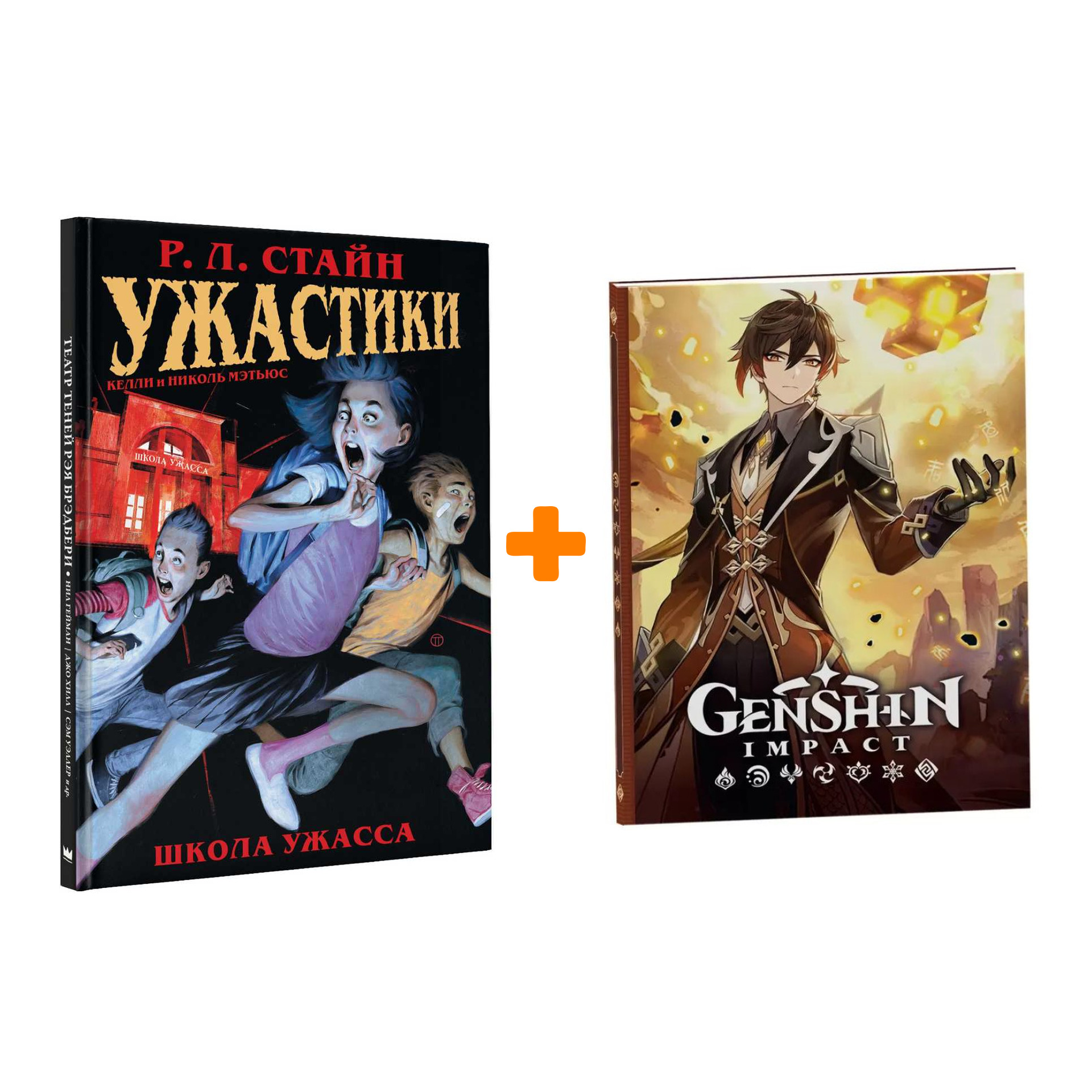 В состав набора входят:Комикс Ужастики: Школа Ужасса, Блокнот Genshin Impact с наклейками (коричневый)Комикс Ужастики: Школа Ужасса:Герои комикса Ужастики: Школа Ужасса, Джесс, Джош и Марко, обнаруживают в темноте школьного коридора странное… существо. Гигантское и механическое, похожее на насекомое не на шутку пугает ребят. Но ни его опасный вид, ни скрежет металлических зубов не останавливают ребят.Блокнот Genshin Impact с наклейками (коричневый):Этот ежедневник понравится всем поклонникам игры Genshin Impact. Удобный формат с иллюстрациями и цитатами ключевых персонажей. Планируйте свои дела, записывайте важные мысли и вдохновляйтесь на новые свершения!