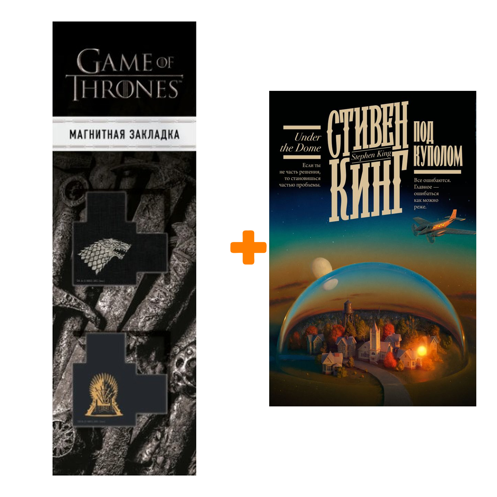 В состав набора входят:Закладка Game Of Thrones: Трон и Герб Старков – магнитная с вырубкой (2 шт.), Под КуполомЗакладка Game Of Thrones: Трон и Герб Старков – магнитная с вырубкой (2 шт.):Серия «Вселенная Игры престолов» – это официальные продукты по одной из самых выдающихся франшиз в истории! Блокноты, постеры, стикеры, значки и многое другое – найдите свою роль в борьбе за Железный трон!Под Куполом:История маленького городка, который настигла большая беда. Однажды его вместе со всеми обитателями накрыло таинственным невидимым куполом, не позволяющим ни покинуть город, ни попасть туда извне. Что теперь будет в городке? Что произойдет с его жителями? Ведь когда над человеком не довлеет ни закон, ни страх наказания – слишком тонкая грань отделяет его от превращения в жестокого зверя. Кто переступит эту грань, а кто – нет?