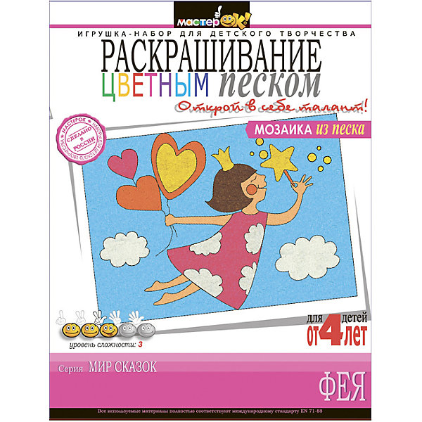 Набор для творчества Раскрашивание песком "Фея" от российского бренда МастерОК понравится маленьким пальчиками и создаст приятное веселое настроение. Пошаговая инструкция подробно описывает процесс выполнения поделки. Легкая и воздушная фея понравится каждой маленькой принцессе. Выполнение этой картинки имеет третий уровень сложности и рекомендуется детям с четырех лет. Сам процесс не занимает очень много времени, поэтому ребенок сможет самостоятельно сделать свой небольшой шедевр и порадоваться результатам. Картинку можно использовать как красивый подарок на память. Работая с таким набором ребенок развивает моторику рук, воображение, усидчивость, аккуратность и внимание.