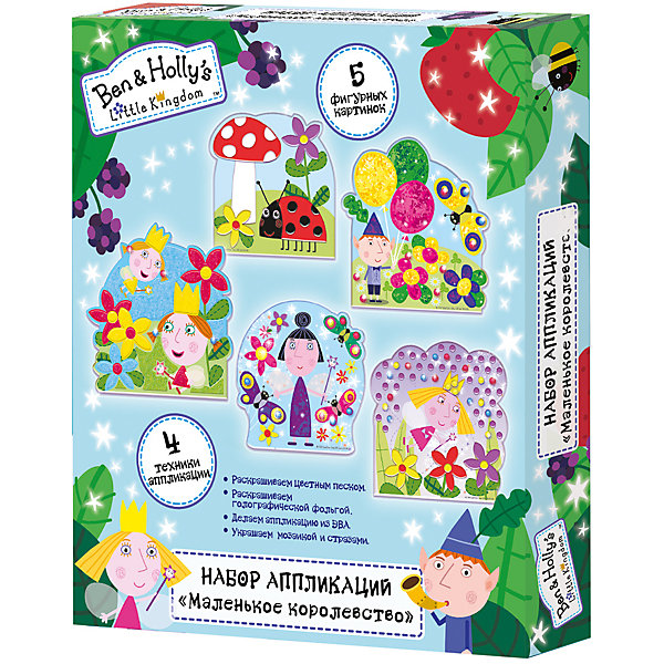 В наборе "Маленькое королевство" ТМ "Бен и Холли": 5 фигурных картинок для аппликации, цветной песок, фольга, самоклеящиеся детали ЭВА, стразы, подставки для картинок. Товар сертифицирован. Срок годности: 5 лет. Упаковка - коробка размером 23х20х3 см.