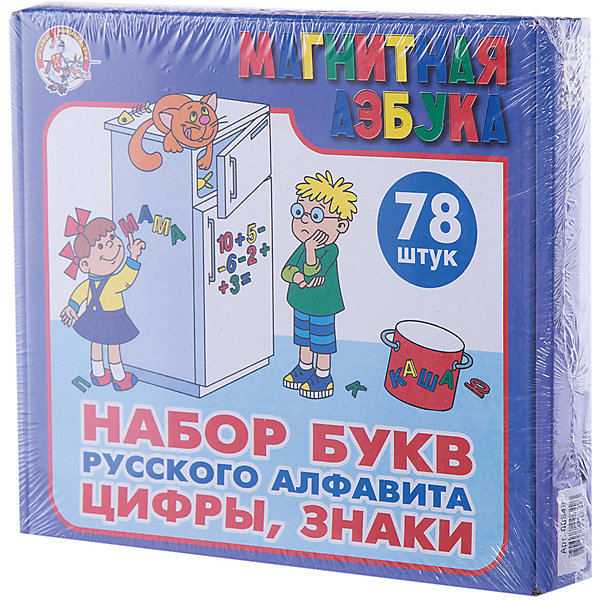 • в наборе: 78 элементов букв русского алфавита, цифр и знаков, комплект магнитов-вкладышей к ним