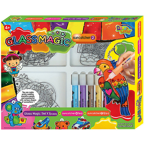 С набором Donerland Glass Magic №2 можно сделать красочные рисунки-подвески. Для этого ребенку предстоит раскрасить картинку-трафарет на прозрачной основе, а затем подвесить поделку за специальную петельку.