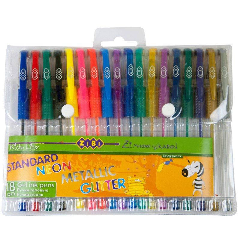 Набор из 18 гелевых ручек с 4 видами чернил в пластиковом пенале с завесом на 2 кнопках: 4 ручки стандартных цветов (синий, красный, зеленый, черный); 4 ручки неоновых оттенков с флуоресцентными пигментами (желтый, розовый, красный, голубой); 4 ручки с блестками (фиолетовый, синий, зеленый, золотой); 6 ручек с металлическими пигментами (зеленый, синий, серебрянный, золотой, фиолетовый, красный). Толщина линии письма 0.7 мм. Корпус: круглый, длиной 140 мм. Металлизированный наконечник. Сменный стержень длиной 107 мм. Эргономичный прорезиненный рельефный грип предпреждает скольжение пальцев при письме и обеспечивает максимально комфортный захват.Стойкое и гладкое чернило, плавно наносится, не вигорает со временем. Упаковка – пластиковый пенал с европодвесом.