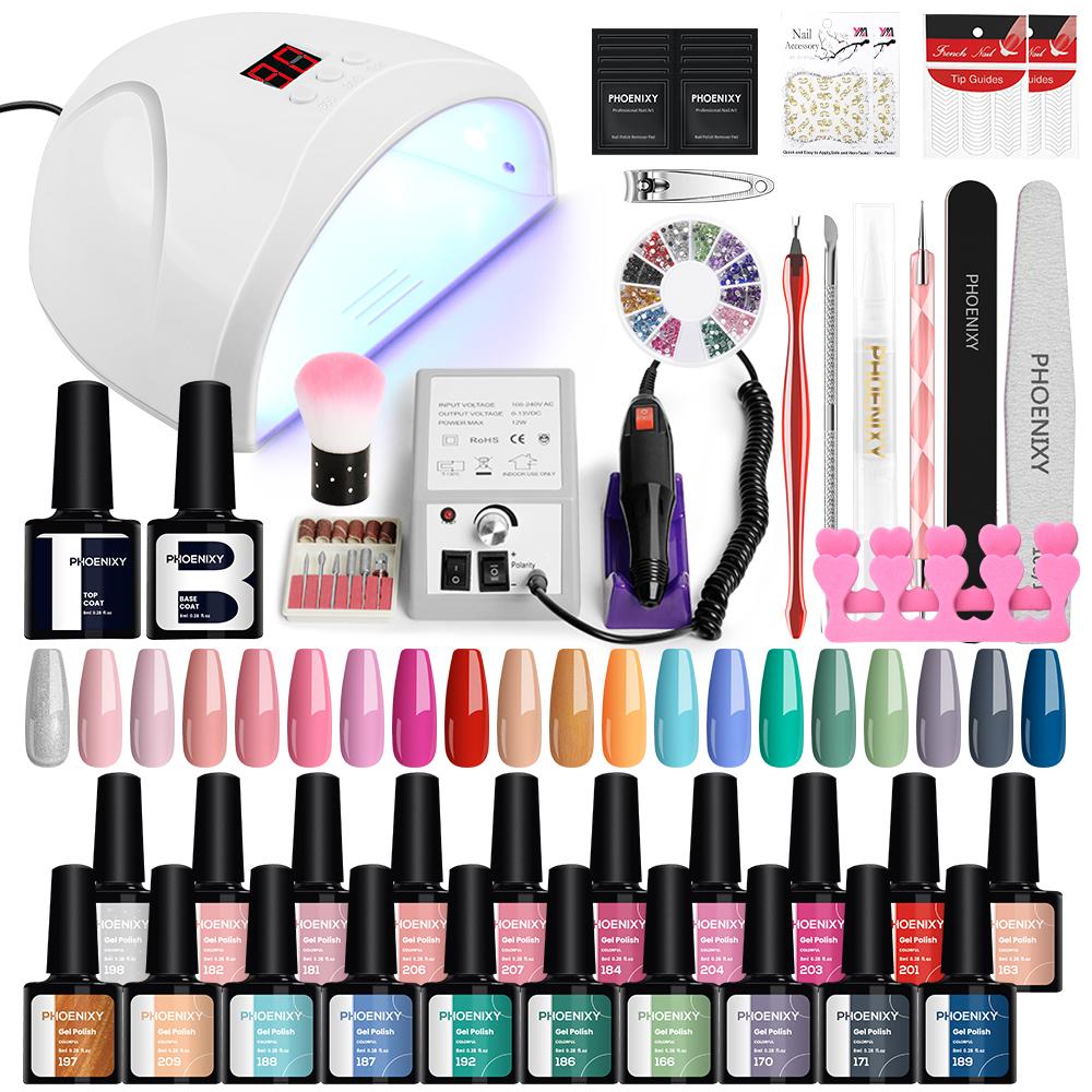 Набор гелей для ногтей PHOENIXY, 20 цветов, лаки для ногтей, фрезы для ногтей, 36 Вт, лампа для ногтей, гель-лак для дизайна ногтей, серия маникюрный набор