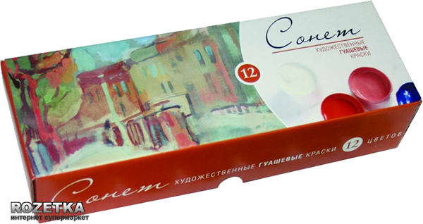Гуашевые краски серии Сонет используются в художественных и художественно оформительских работах. Они легко наносятся на бумагу и картон. После высыхания краски приобретают бархатистой матовой поверхности, легко размываются водой.Краски изготовлены по новой технологии: в рецептуре использованы пигментные пасты (а не пигменты, как в профессиональной гуаши), и в качестве связующего — синтетическое связующее (в отличие от профессиональной художественной гуаши, рецептура которой включает пигменты гуммиарабик).В состав набора входит 12 красок в банках: белила титановые, желтая, охра светлая, красная, английская красная, фиолетовая, сине-зеленая, синяя, изумрудная зеленая, зеленая темная, коричневая, черная.Отлично подходят для начинающих.