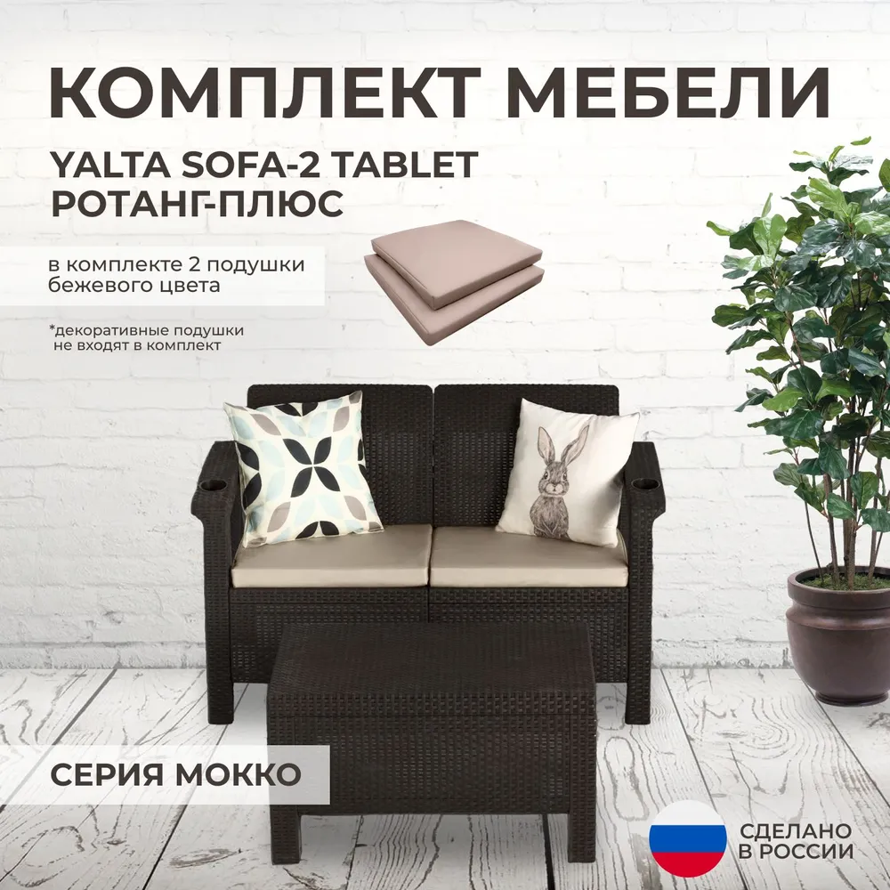 Предлагаем вашему вниманию комплект мебели YALTA SOFA-2 TABLET (Ялта) из пластика под искусственный ротангРазмеры мебели,см:Столик: длина76,5, ширина57, высота42.Диван двухместный: длина127, ширина70, высота79.Подушка на сиденье: ширина 54, глубина 50, высота 5 см.Комплектация:Столик: 1 шт.Диван: 1 шт.Подушка: 2 шт.Характеристики мебели:Материал мебели: полипропиленЦвет мебели: моккоМатериал подушек: ткань Оксфорд D600, наполнитель - холкон плотностью 1200гр/м2, подушка с замком.Цвет подушек: бежевыйТолщина подушки сиденья: 5 смДопустимая нагрузка Диван - 212 кгМебель поставляется в коробках в разобранном виде.Размер упаковки, см:Столик: длина78, ширина58, высота20. Вес: 4,12 кг. Объем: 0.09 м3Диван двухместный: длина118, ширина70, высота36. Вес: 11,36 кг. Объем: 0.297 м3Общий вес: 16 кг, общий объем: 0,73 м3Преимущества:Эргономичный дизайнСделано из прочного пластикаНеметаллическая рама - не ржавеет и не гниетПростая сборка без навыковБлагодаря стойкому к высоким температурам полипропилену, цвета не выгорают и не бледнеютЛегко мыть и удобно хранитьВстроенные подстаканникиМебель серии Yalta - прекрасный выбор для дачи, загородного дома, веранды и сада. Мебель с эффектом плетения ротанга из литого пластика. Мебель в разобранном виде занимает мало места, легко собирается и разбирается, удобный в перевозки и хранении. В подлокотниках встроены специальные подстаканники. Зону отдыха также можно дополнительно укомплектовать обеденным столом серии Yalta. Прочный всепогодный материал пластик под плетение ротанга, устойчивый к выгоранию. Долговечная неметаллическая рама: не гниёт, не ржавеет. Усиленные конструкции с множеством ребер жесткости для еще большего комфорта и безопасности. Мебель выдерживание нагрузки на одно посадочное место 106кг. Пластик полипропилен. Обязательно инструкция по сборке в комплекте каждой коробки.