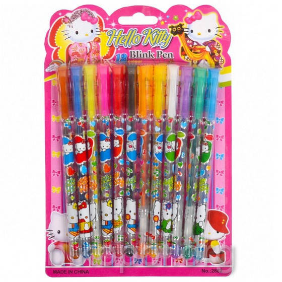 Набор из 12 гелевых ручек с изображением героев "Китти". Расцветка закрывающего колпачка соответствует цвету чернил (с блесками).