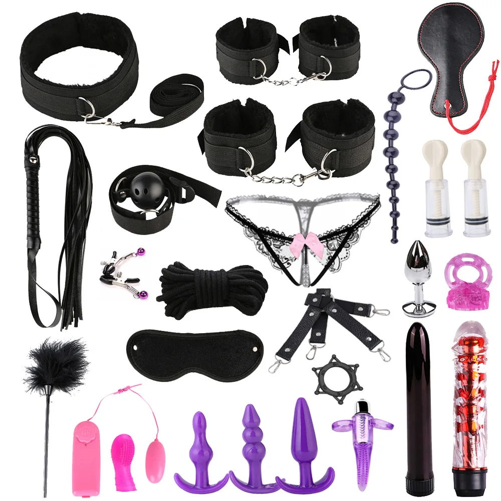 Набор для БДСМ-связывания для женщин и мужчин, интимные игрушки, набор для фетиша, кнут, зажимы для сосков, Анальная пробка, кляп, плюшевые на...