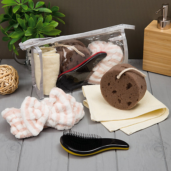 • в комплекте: полотенце-салфетка, повязка на голову, расчёска, мочалка, косметичка