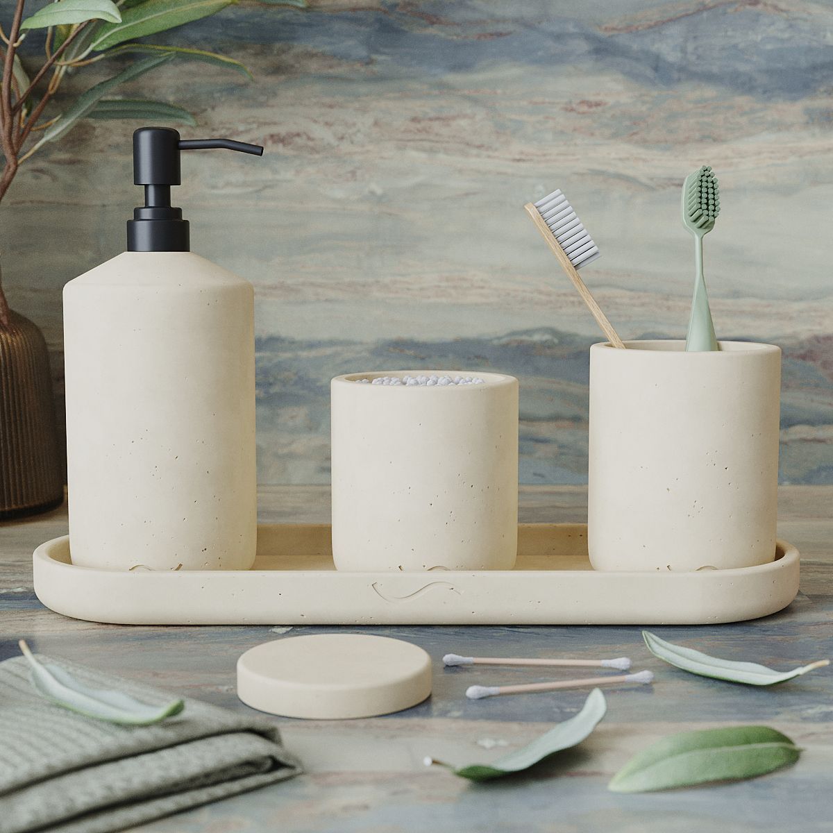 Набор Astrid № 19 от MUSKO HOME - набор декоративных аксессуаров для ванной комнаты, состоящий из 4-х предметов: декоративного подноса (подставки для украшений), стакана для зубных щёток, диспенсера (дозатора для мыла) и емкости с крышкой для ватных дисков и палочек. Все изделия (стакан для зубной пасты и щеток, диспенсер, органайзер для мелочей в виде банки с крышкой и подставка для колец, сережек и прочих украшений) изготовлены вручную из особо прочного архитектурного бетона и обработаны матовым двухкомпонентным лаком. Благодаря этому поверхности органайзера для ватных дисков, стакана, дозатора для жидкого мыла и подставки надёжно защищены от воды и появления разводов. К каждому изделию в наборе прилагаются самоклеящиеся фетровые и силиконовые накладки.В комплект входят: Стакан для ванной Astrid | 9x9x11 см | 1 шт.Дозатор для жидкого мыла Astrid | 9х9х20 см | 1 шт. Емкость для ватных дисков Astrid S с крышкой | 9x9x10 см | 1 шт. Поднос декоративный Astrid | 36х11 см | 1 шт.Банка с крышкой из набора представляет собой контейнер для ватных дисков и палочек. Помимо этого, в данном органайзер можно применять для хранения мелочей, а также сережек. В дозатор для мыла помещают жидкое моющее средство (можно и шампунь). Диспенсер выдает мыло в фиксированных дозах, что очень удобно. Также удобство заключается и в том, что, имея дозатор из набора, можно не пачкать брусочками мыльницу или раковину. Стакан для зубных щеток и пасты – удобная и стильная подставка. Такой держатель впишется в интерьер любой ванной. Декоративную тарелку- поднос из набора можно использовать как подставку для украшений (колец, сережек), так и как интерьерную подставку для духов, косметики или как органайзер для мелочей. Набор для ванной комнаты отлично подойдет как подарок. Лаконичный дизайн бетонных вещей позволяет им идеально сочетаться. Декоративные изделия из бетона - это стиль, качество и невероятная долговечность. При аккуратном обращении диспенсер, стакан для зубных щеток и пасты и емкость для ватных палочек и дисков будут служить десятилетиями. Создавайте свой неповторимый интерьер и атмосферу с набором для ванной от MUSKO HOME.