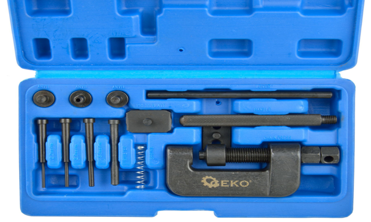 Комплект инструмента предназначен для расклепки и клепки цепей привода ГРМ и приводных цепей. Набор пригодится в мотоциклетных, велосипедных и автомобильных мастерских. Для цепей с шагом от 25 до 630 (примечание: для цепей 530 и 630 сначала отшлифуйте головку заклепки), подходит для сборки цепей ГРМ.