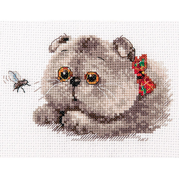 Небольшой формат хорошо подходит как для начинающих, так и для уже имеющих опыт в вышивке рукодельниц. На картине изображен кот с пухлыми щеками, украшенный пышным бантом. Он внимательно следит за кружащим у его носа насекомое.