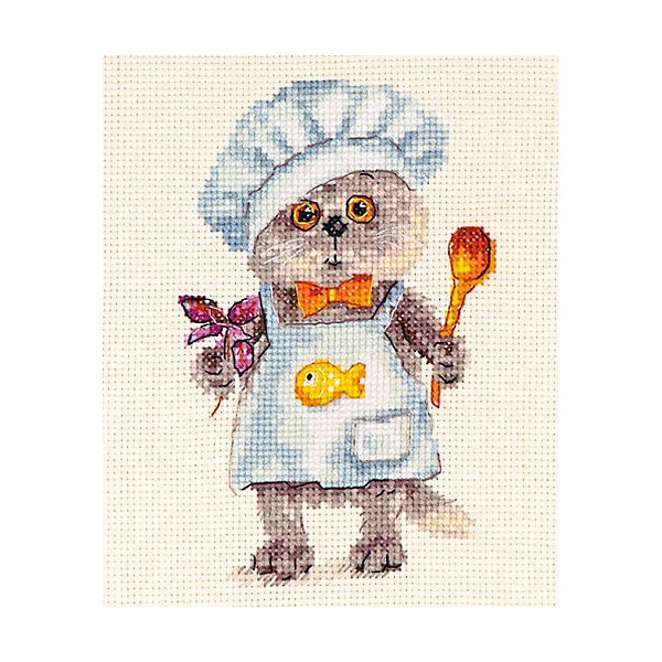 Небольшой формат хорошо подходит как для начинающих, так и для уже имеющих опыт в вышивке рукодельниц. На картине изображен кот с галстуком-бабочкой в поварском колпаке и фартуке. Образ завершают веточка базилика и ложка для готовки в лапах.